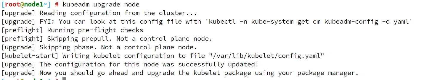 [upgrade/kubelet] Now that your control plane is upgraded, please proceed with upgrading your kubelets if you haven't already done so.注意:因为我是单master节点,所以就在这一个主节点上执行就可以,如果您是多master节点,在另外的master节点上执行kubeadm upgrade node