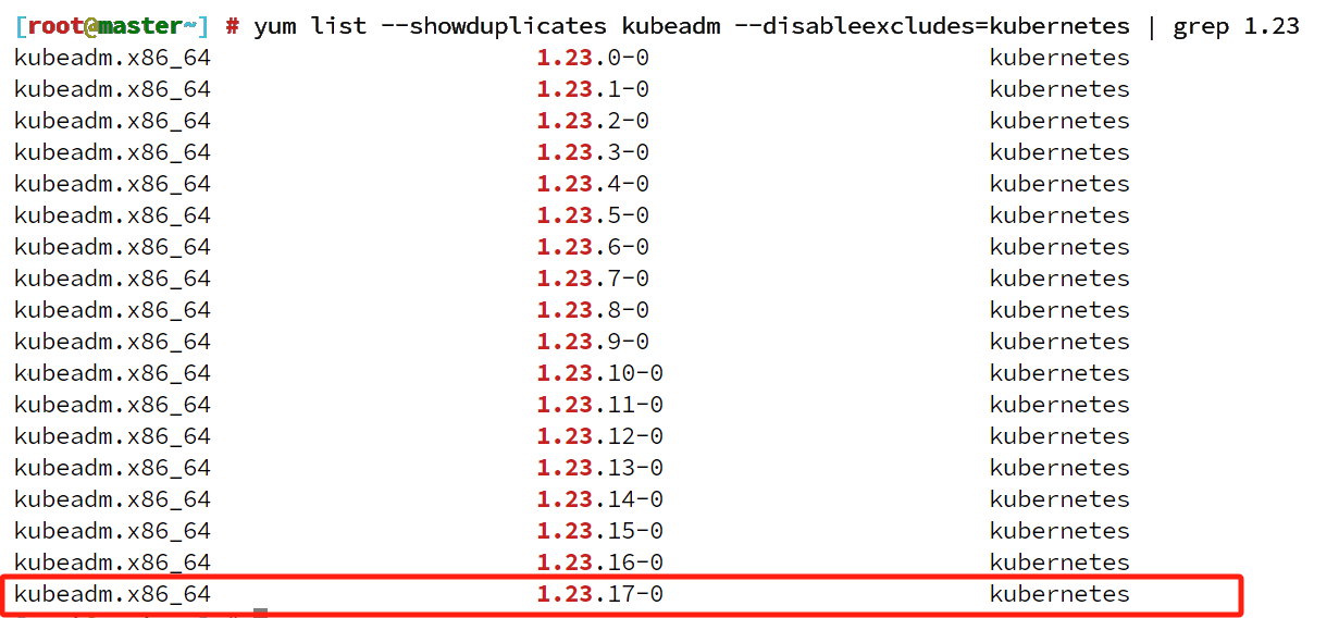 [root@master~] # yum list --showduplicates kubeadm --disableexcludes=kubernetes | grep 1.23